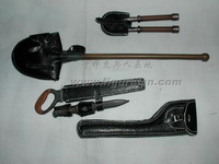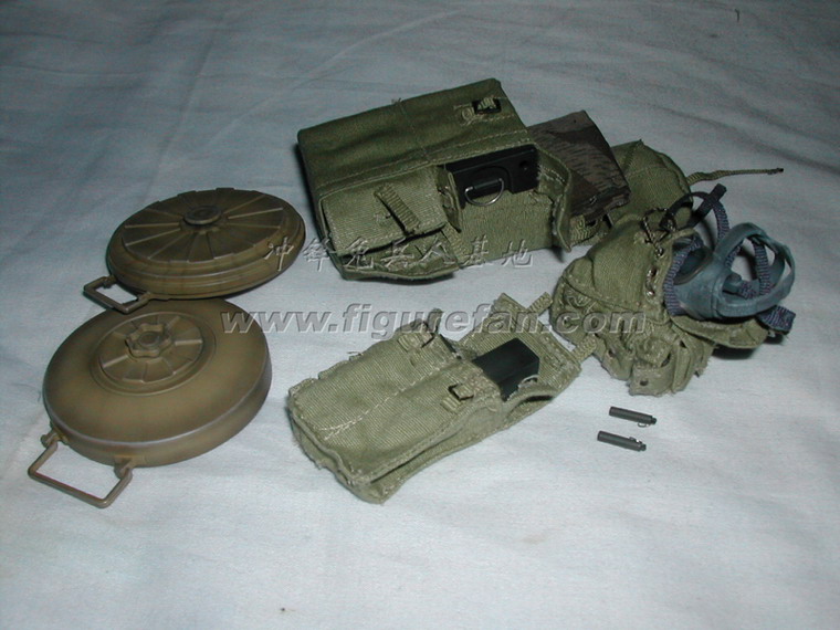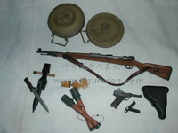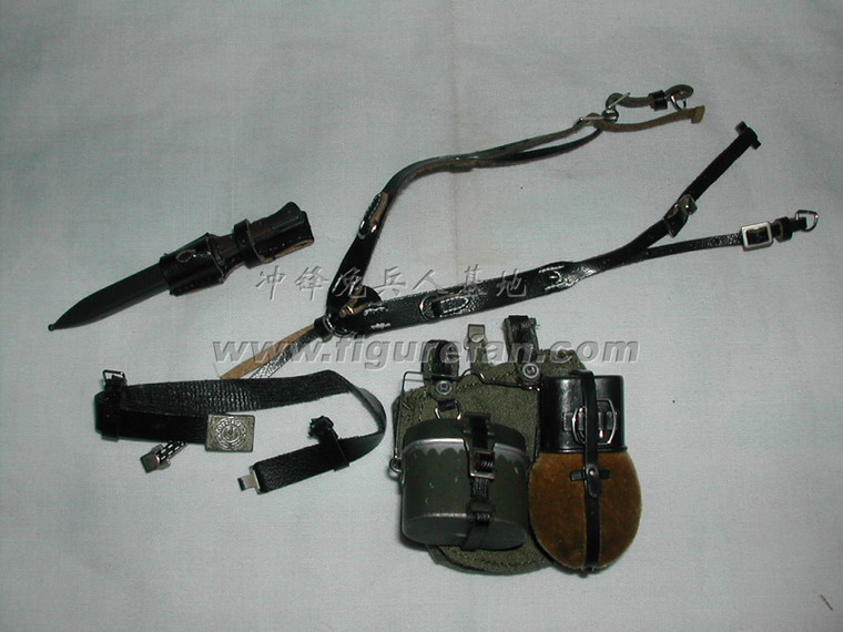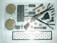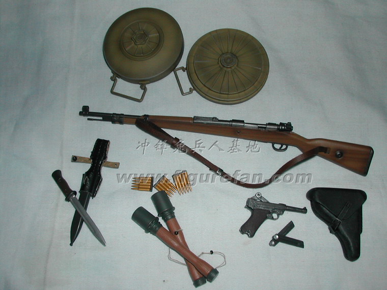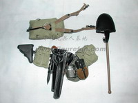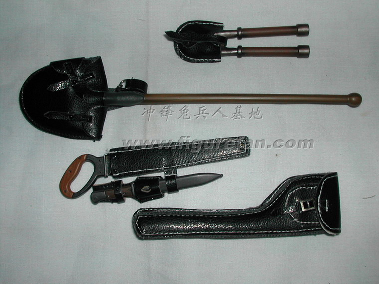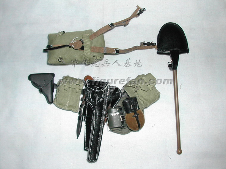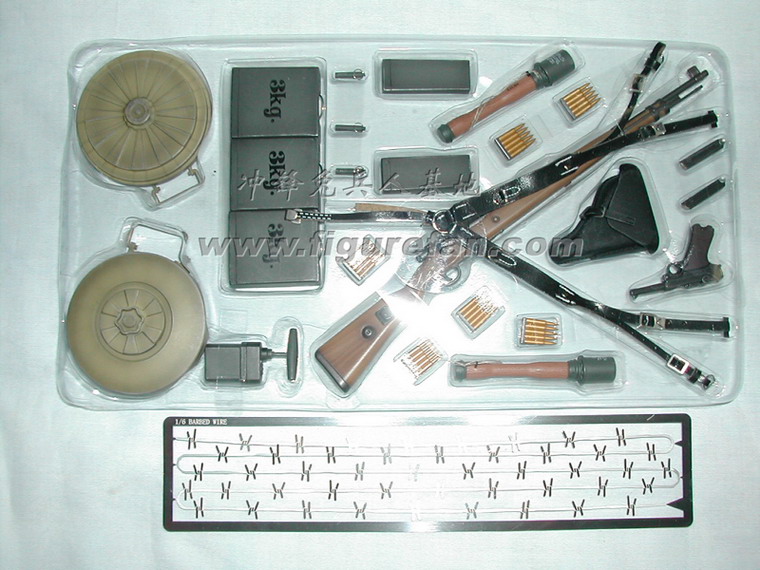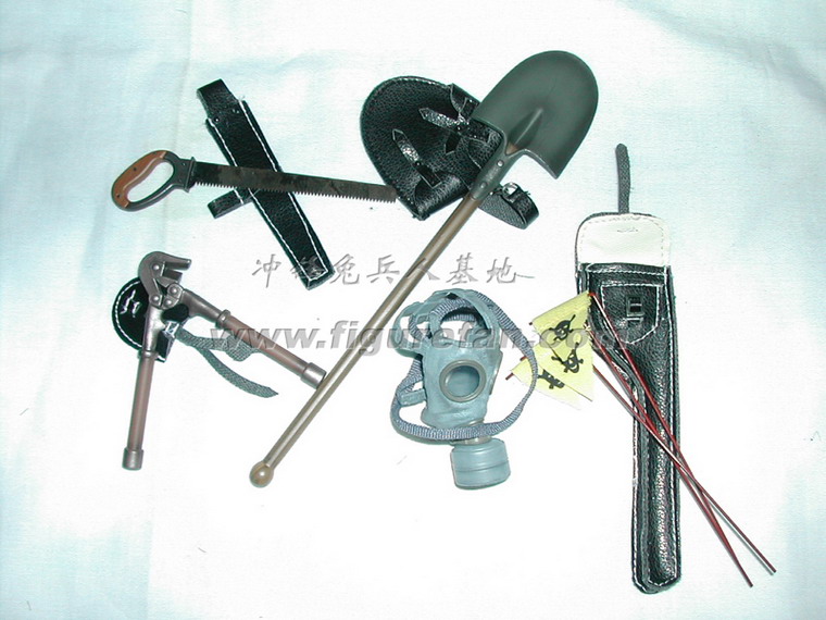 套件中有长柄铁铲和皮套、钢丝钳和皮套、锯子(金属+旧化)和皮套、地雷标竿和皮套、1公斤和3公斤的炸药和雷管、引线、起爆器、反步兵地雷和反坦克地雷、工兵专用的背囊、挎包、沙色涂装的M35钢盔、防毒面具等绝大多数都是第一次出现,而且做工精良。着款兵人还采用了许多非常精良的配件,比如SOLDAT001的M36国防军制服,带内衬和皮带固定钩;威龙美国限定版70326使用的NP05版枪机可以拉动的P08手枪。此外还有一段金属蚀刻片制作的铁丝,非常超值!可以说这个兵人标志着目前威龙兵人的最高水准